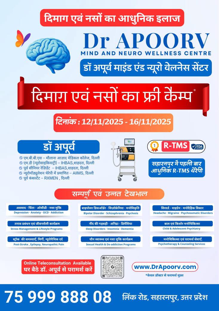 Read MoreJoin our Free Mind & Nerve Camp from 12 тАУ 16 Nov 2025 at Dr Apoorv Mind & Neuro Wellness Centre, Link Road, Saharanpur. Know more about Depression, Anxiety, OCD, Sleep, Headache, and modern treatments like rTMS. 75 999 888 08 |